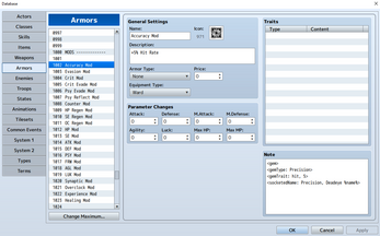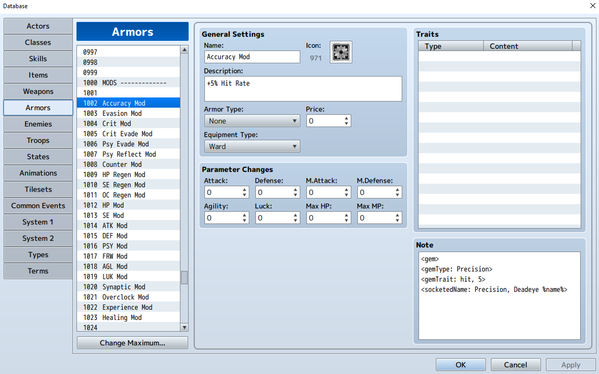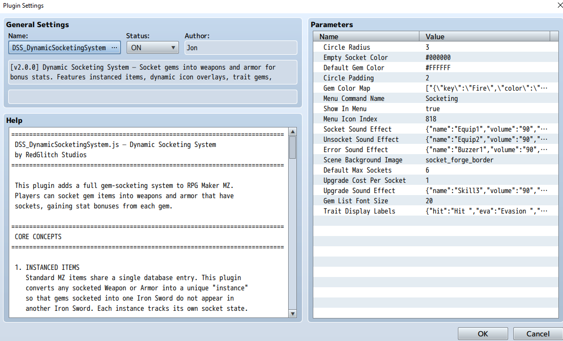 Supports all 8 base parameters as flat bonuses, plus 20 percentage-based traits including Hit Rate, Crit, Evasion, MP Cost Rate, Guard Effect, TP Charge Rate, Physical/Magical Damage Rate, and more. Features configurable socket types for gem restrictions, random socket rolls on loot drops, socket upgrades, set bonuses for matching gem types, and a fully custom Socket Forge scene with preview and confirmation. Compatible with VisuStella plugins.